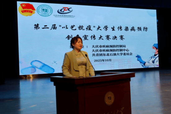 大庆市疾病预防控制中心副主任刘劲松现场致辞,他指出,近年来,大庆市传染病疫情的流行态势与传播风险依旧呈现出复杂多变的特征。高校作为人员密集的场所,疫情防控工作面临着新的压力与挑战。青年参与传染病预防宣传意义重大,寄语学子们以创意作品为载体,传递科学防疫理念。